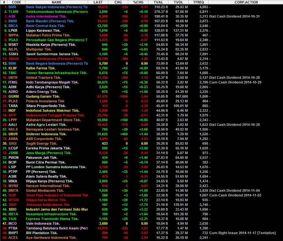 - Hal yang kurang menggembirakan adalah asing hanya melakukan net buy 1 hari saja yaitu pada hari pelantikan Jokowi-JK, sedangkan hari kemarin asing sudah melakukan net sell kembali sebesar 304 milyards , terutama saham-saham BBRI, BMRI, SMGR, TLKM, INDF, GGRM, dan asing melakukan net buy pada saham TBIG, KLBF, BBNI, ADRO.